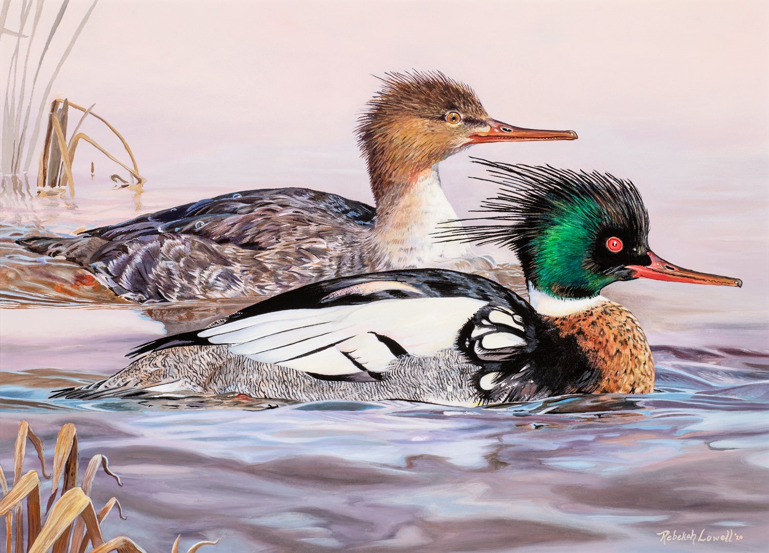 Rebekah's oil painting of a pair of Red-breasted Mergansers has won the 2020 Maine Duck Stamp contest, bringing in her fourth win since 2011. Purchase the limited edition prints here!