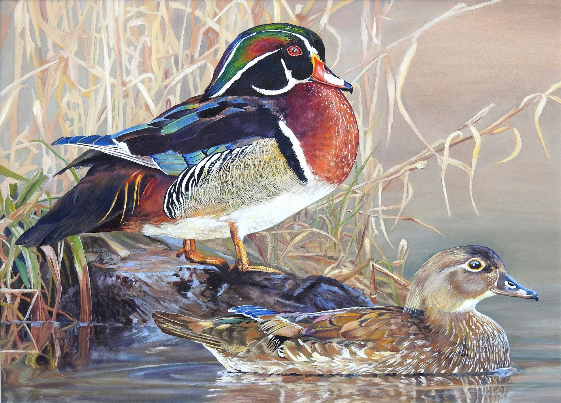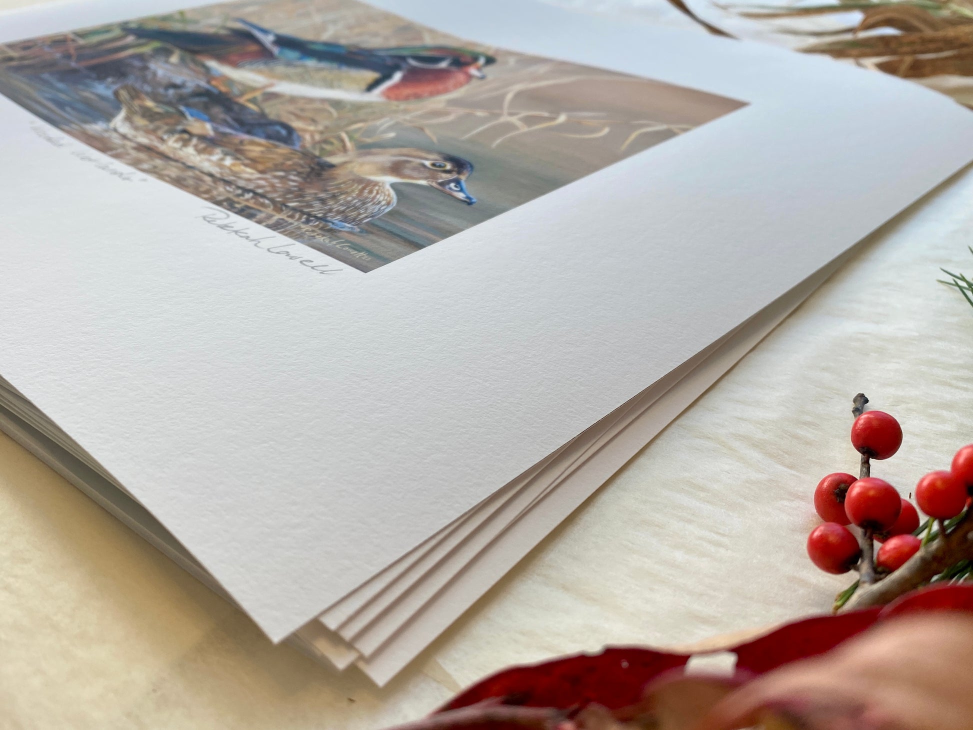 The original painting used to create this print was 13" x 18" and was completed in oils on Ampersand board. The species is the Wood Duck, and the title of the painting is "Wooded Wetlands". The print image is 6.5" x 9" on 12" x 14" paper. This is the standard collectible size for all duck stamp prints. This fine art giclee print is created in archival inks on archival paper. Only the highest quality materials were used in the making of this print. Prints are numbered ____/50. All prints are signed and numbered in pencil by me, the artist, Rebekah Lowell. No unsigned prints have been published.