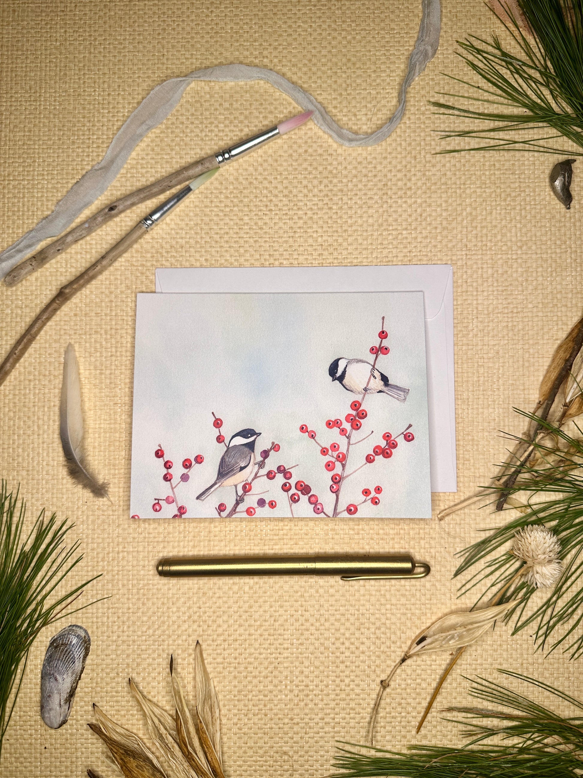 Blank notecard featuring Back-capped Chickadees on red winter berries.