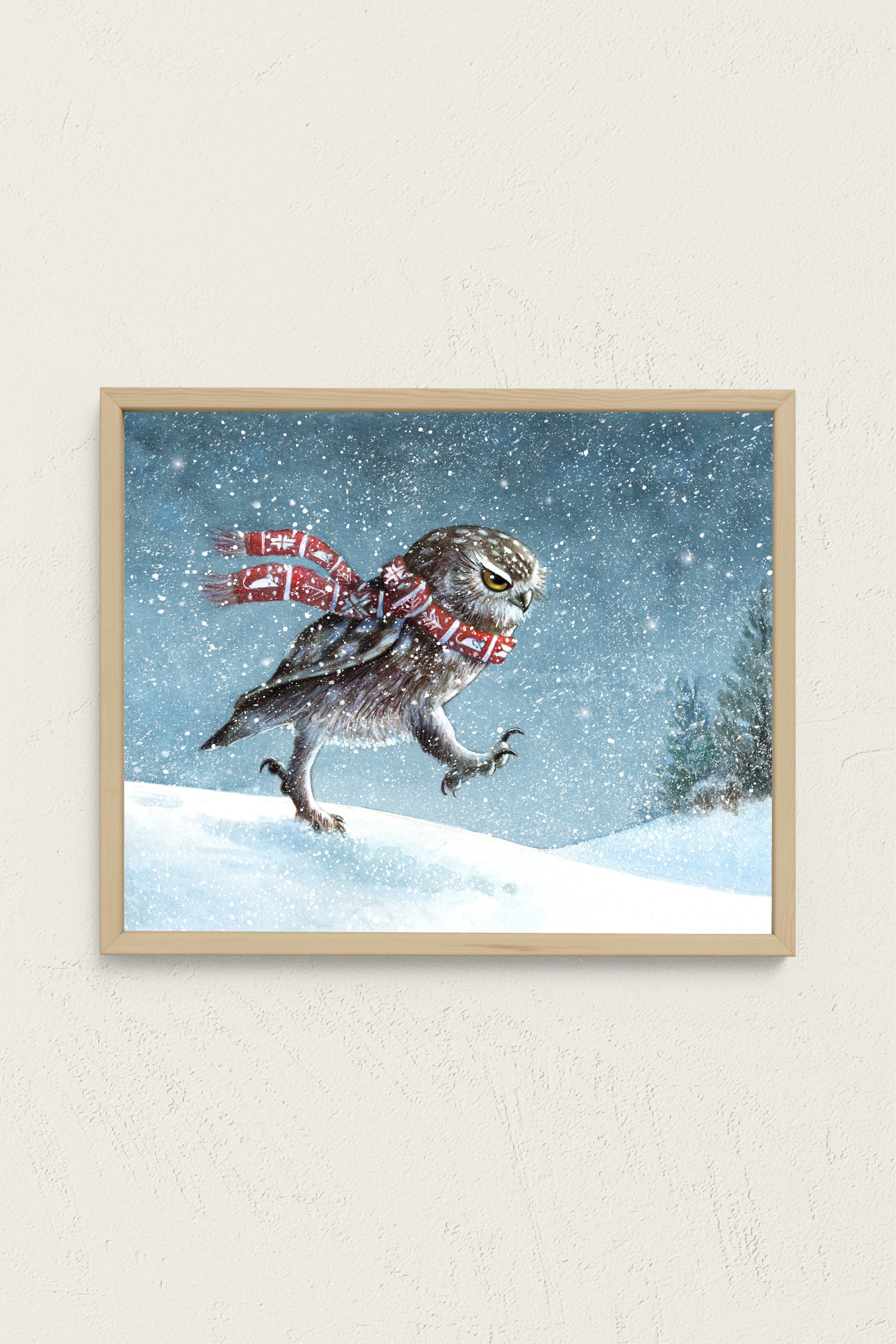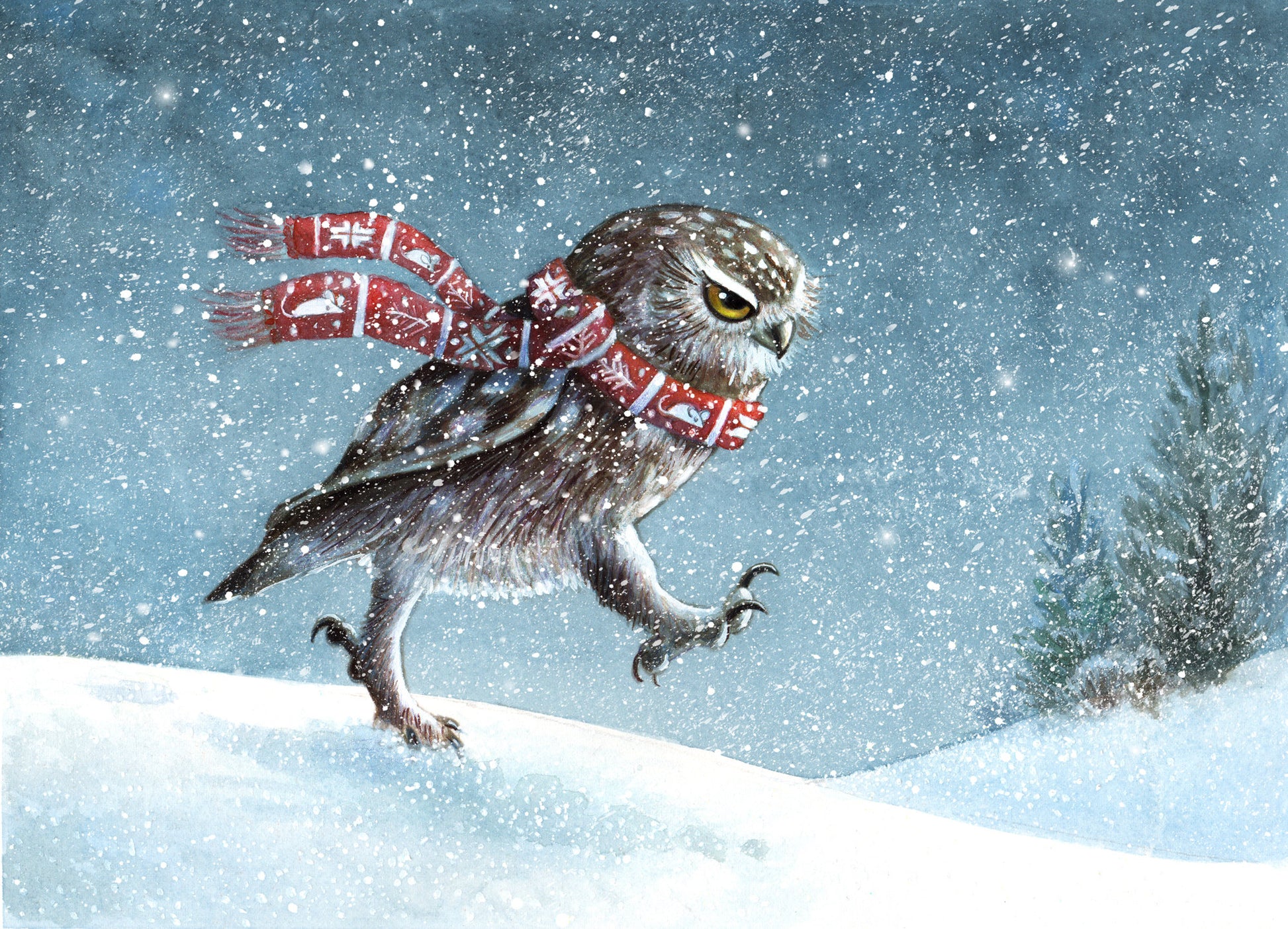 This Grumpy Owl came to me as a drawing prompt for the word "trouble". He began as a sketch in pencil, but as winter came around, I wanted to add color to him and he developed further into this character— grumpy about something (he hasn't told me yet), and making his way through a snowstorm. In the original painting I used watercolor, gouache, colored pencil, and acrylic paint. Size 5" x 7" or 8" x 10" Signed as an artist proof print (A/P)