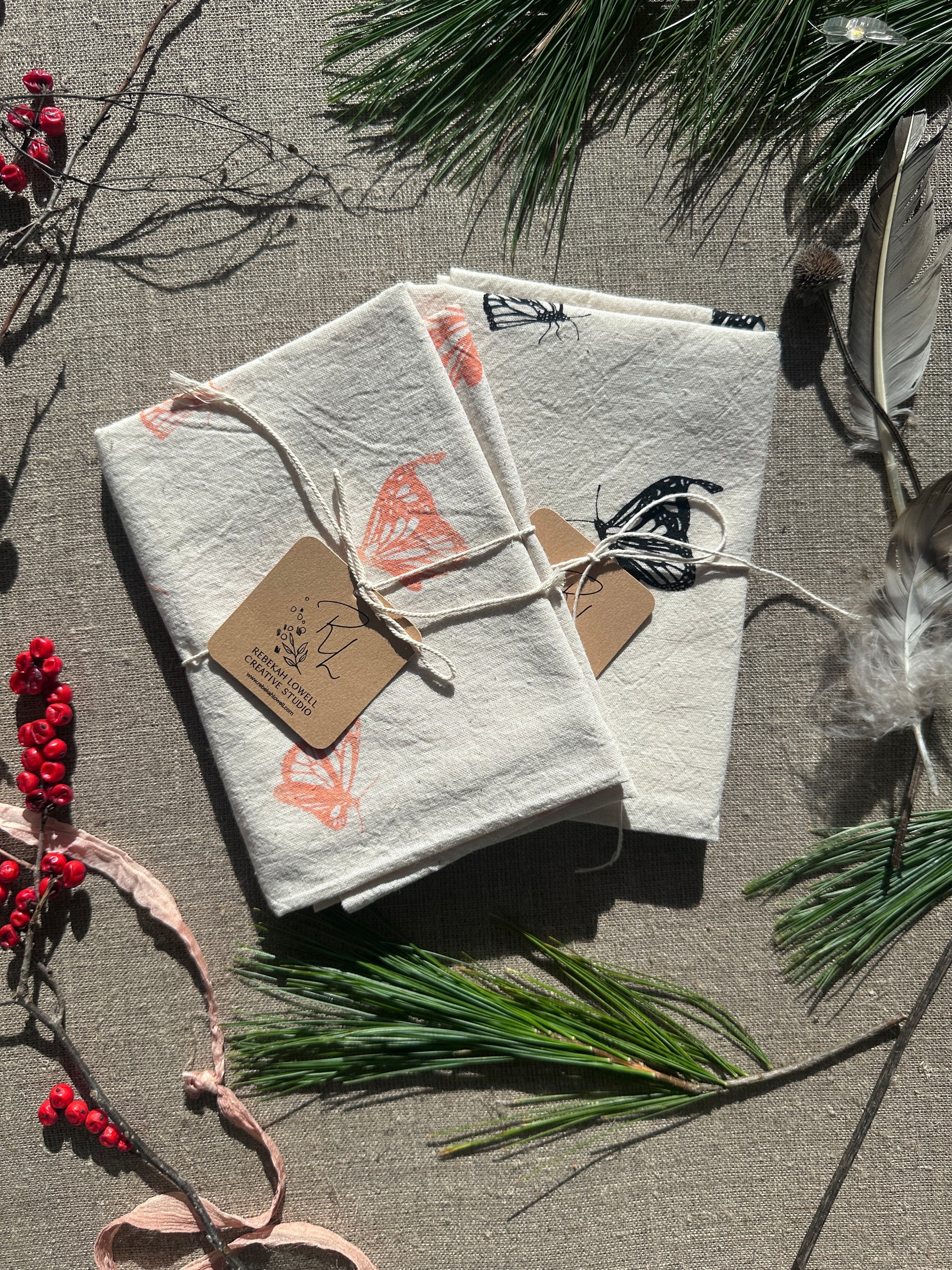 100% cotton silkscreened tea towel with loop, designed with a monarch butterfly patter. Towel color is natural.