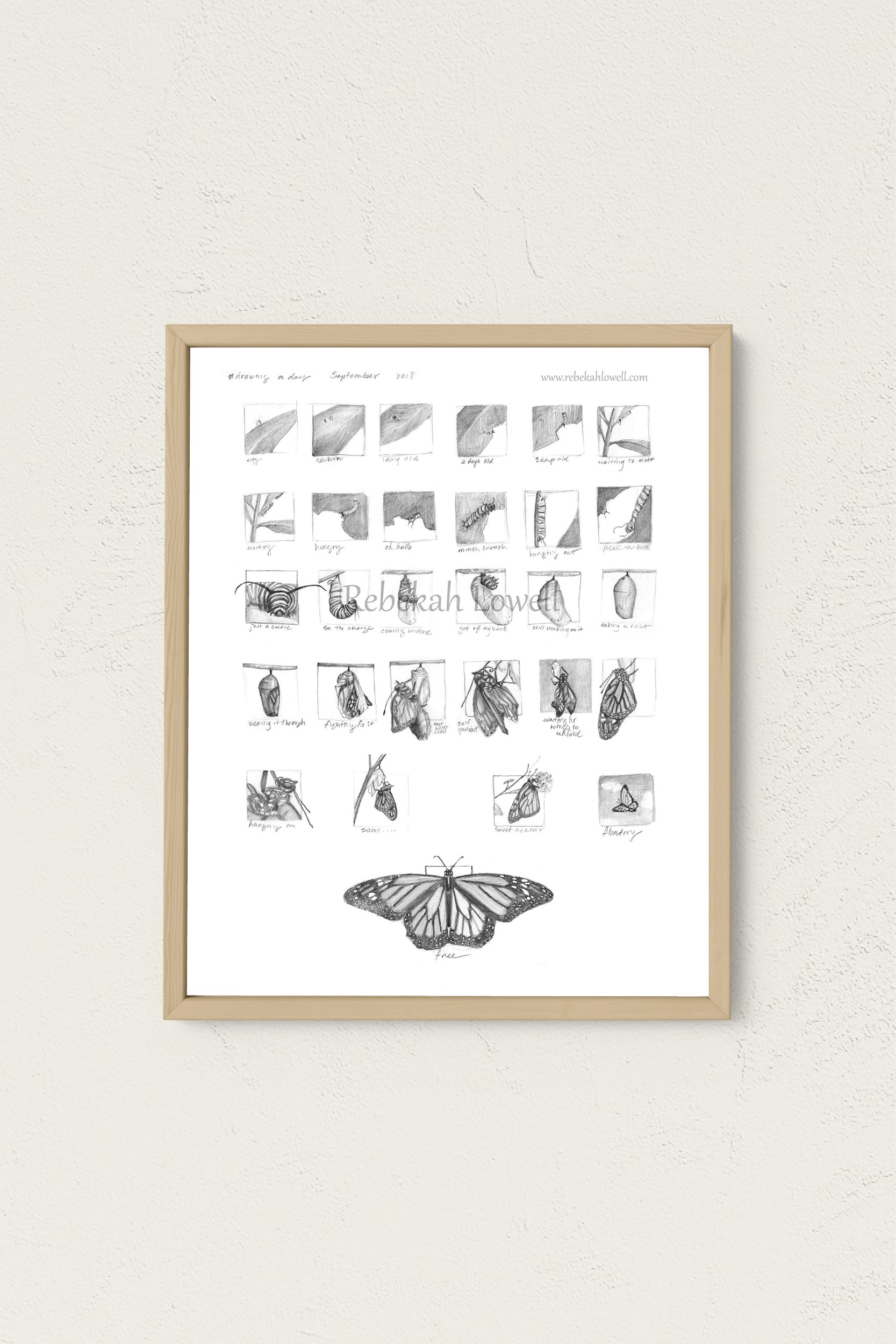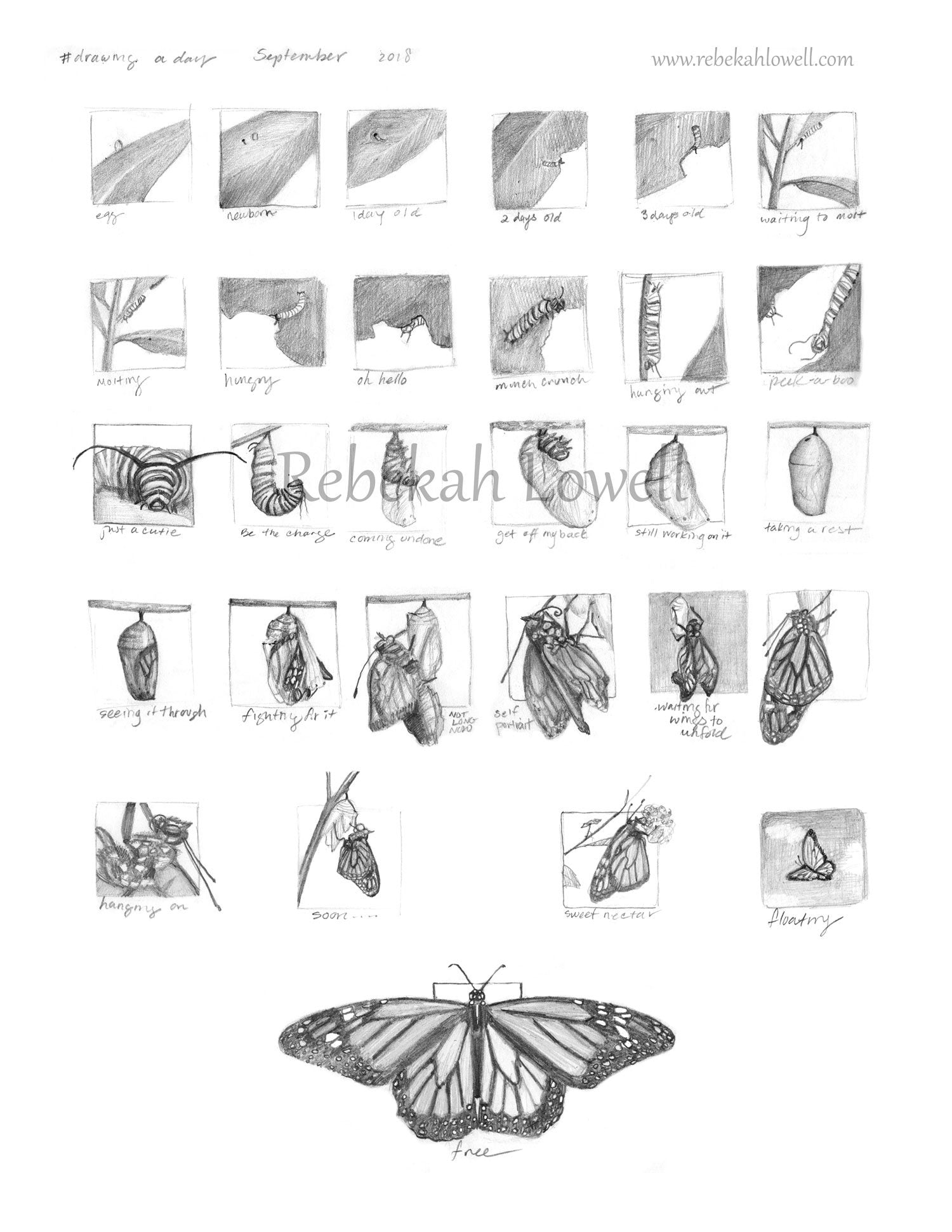 Created for the House of Illustration, Drawing a Day challenge in September of 2018. I drew one 1" x 1" drawing each day in September and the subject I chose to focus on was monarch butterflies and the changes they go through. Many love the beauty of the monarch, but not many consider the struggle it goes through on its way to achieving wings.