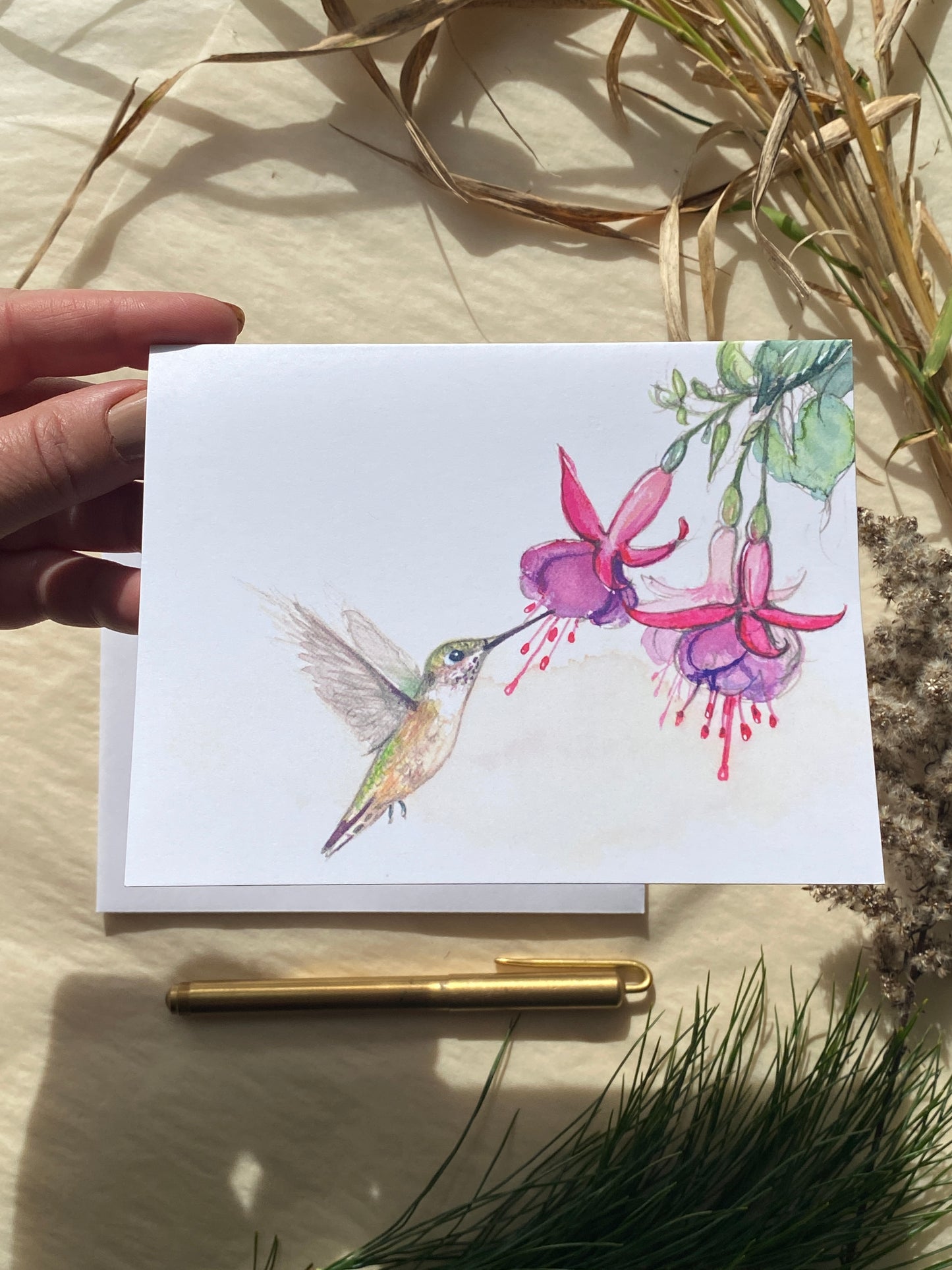 Blank notecard featuring a female Ruby-throated Hummingbird feeding on fuchsia.