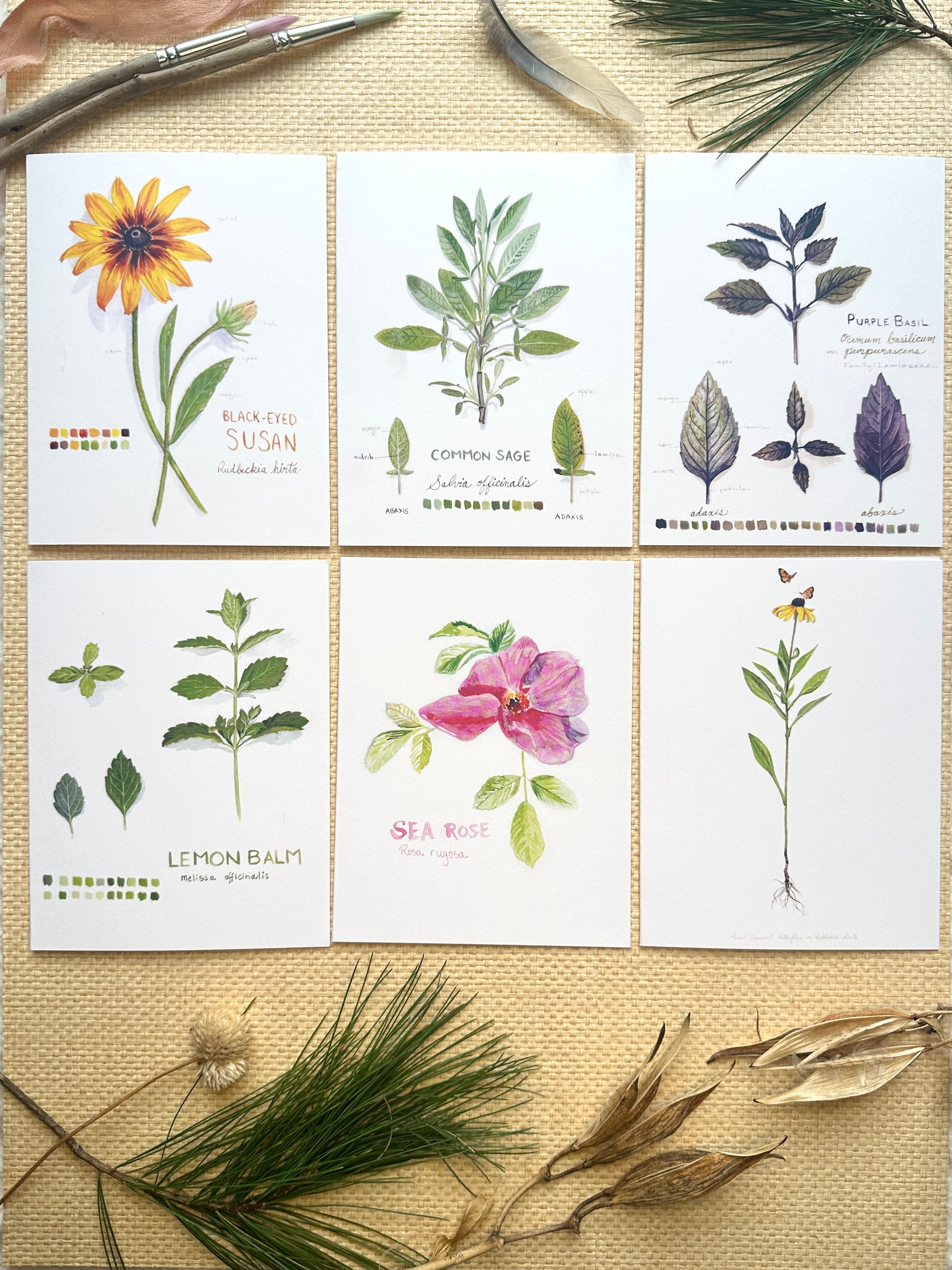 Set of six blank notecards featuring botanical illustrations.